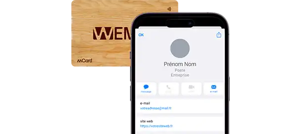 🔹 Grâce à sa puce NFC intégrée, votre carte permet un partage sans contact, simplement en l’approchant d’un smartphone compatible NFC (la technologie est disponible nativement sur tous les iPhone depuis le XS et sur la plupart des Android).